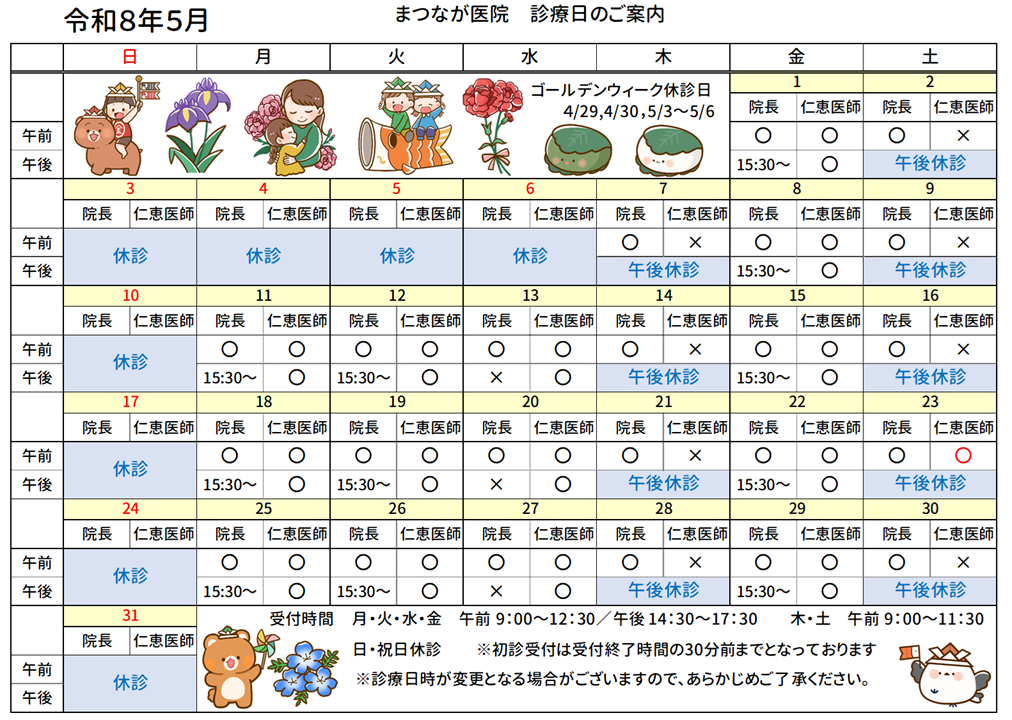 ※5月3日(日)~5月6日(水)はゴールデンウィークのため休診となっております。